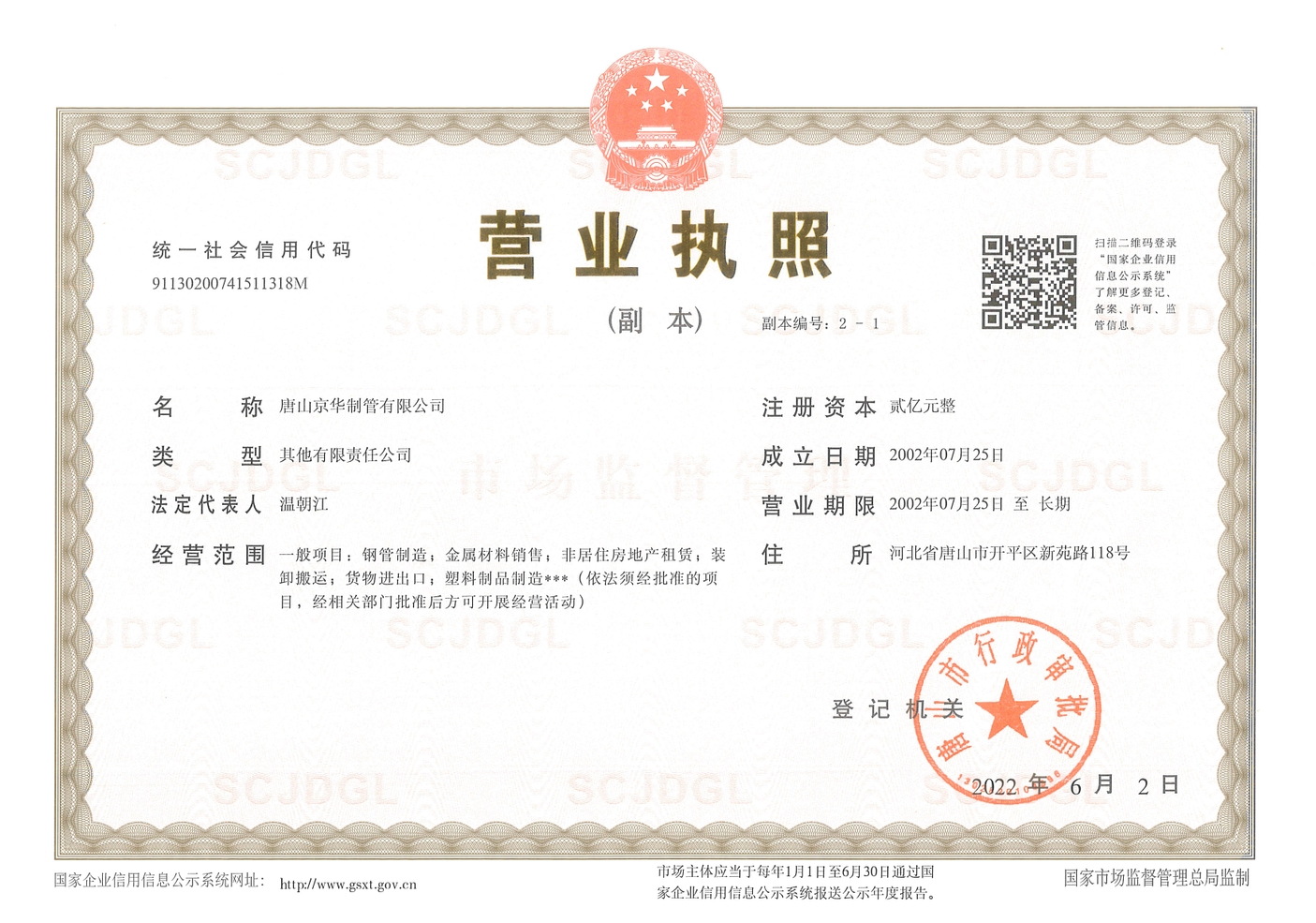 唐山京華制管有限公司 營業執照 版權所有: Copyright 2020-2023 All rights reserved. 冀ICP備19025769號-1  互聯網違法信息舉報  技術支持:文豪科技